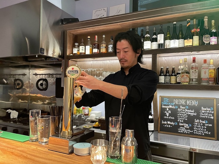 店名は「家族、職場に続く第3の心安らぐ居場所になれたら」という思いで付けました。おすすめは「ハイネケン生ビール」。生のおいしさはもちろん、UEFAチャンピオンズリーグスポンサーのハイネケン推し。一期一会を大切に居心地の良いBARを目指しています。
